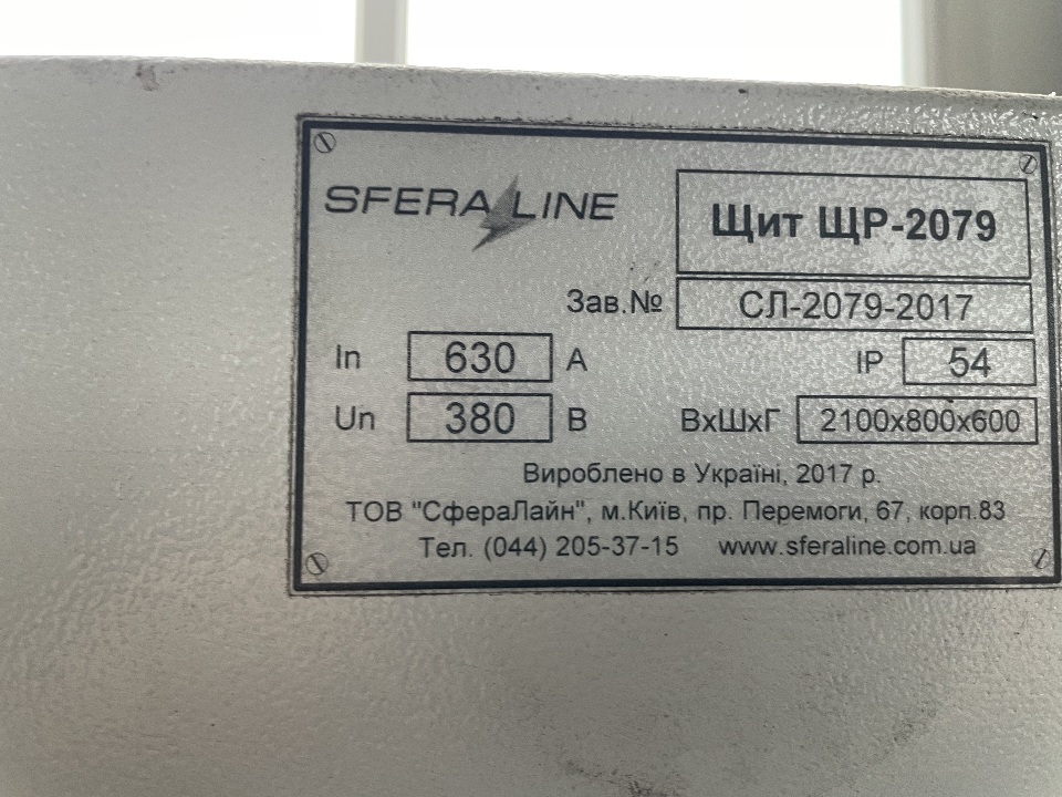 Щит розподільчий, марки SFERA LINE, моделі ЩР-2079, заводський номер СЛ-2079-2017, рік виробництва 2017, виробник Україна, комплектний, технічний стан добрий, використовується для організації введення і розподілу електричної енергії по споживачам.