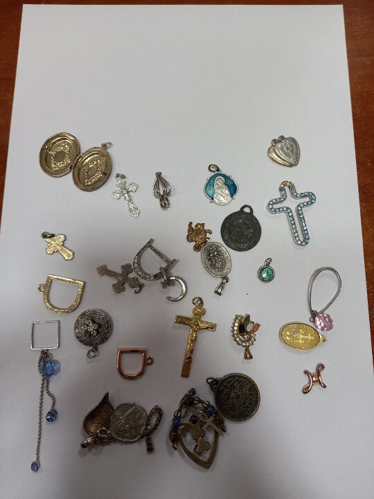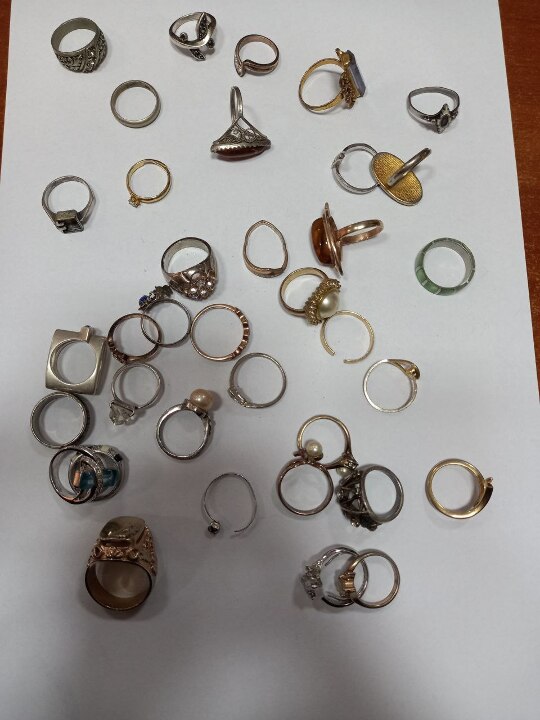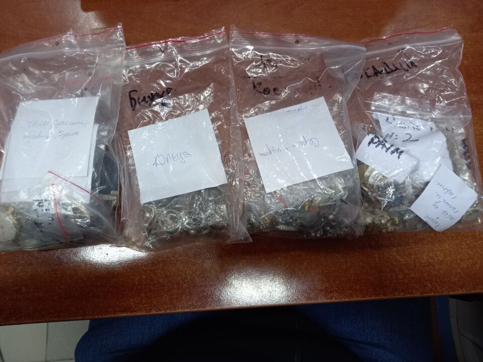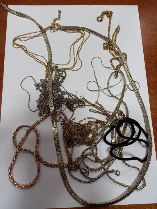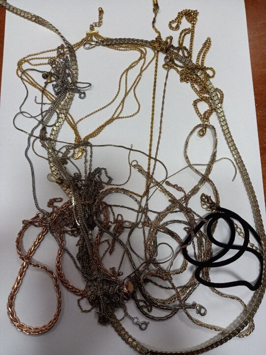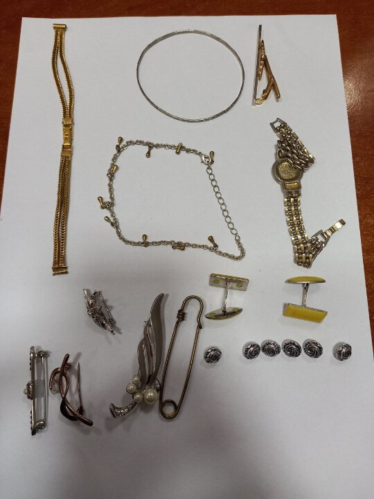 Конфісковане майно за рішенням суду біжутерія у асортименті : ланцюжки 21 штука, сережки 87 штук, кільця 36 штук, кулони 28 штук, браслети 4 штуки, гудзики 6 штук, брошки 7 штук, шпилька 1 штука, запонка 2 штуки, кольє 5 штук, б/в.