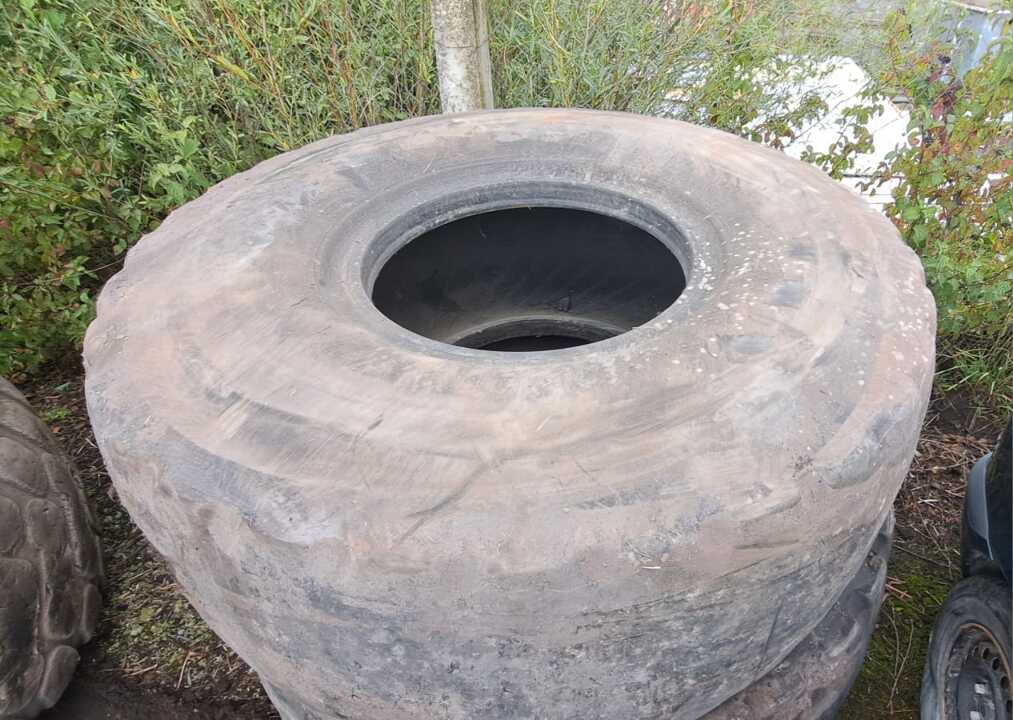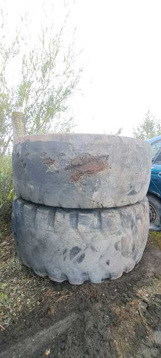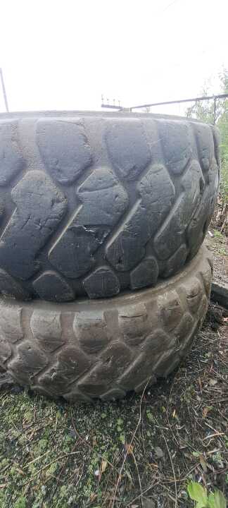 Дві пневматичні шини гумові, які були у використанні марки MICHELIN, розміром 26,5/R25 та два коліса бувших у використанні марки TRIANGLE, розміром 26,5/R25. Значно зношені, мають численні порізи та тріщини.
