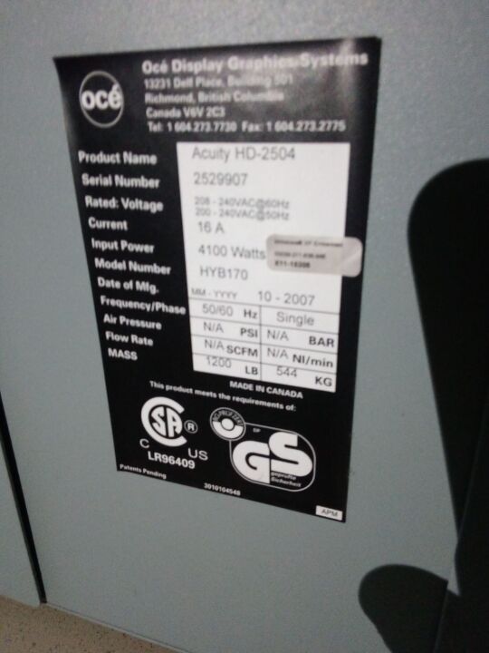 Планшетний цифровий 4-ох кольоровий УФ принтер Fujifilm Acuity HD 2504 з 8 друкарськими головками з перемінною краплею 2007 року випуску. Частинами принтера є: великий вакуумний стіл та рухомий портал. Згідно зі специфікаціями на вказаний принтер виробнича швидкість принтеру до 16 куб.м. в час. Наявний бортовий комп’ютер з автономним пультом оператора, а також робоча станція для RIP з 17-ти дюймовим монітором. Програмне забезпечення: Onyx Production House RIP або Color Gate RIP. Технічний стан принтера невідомий.