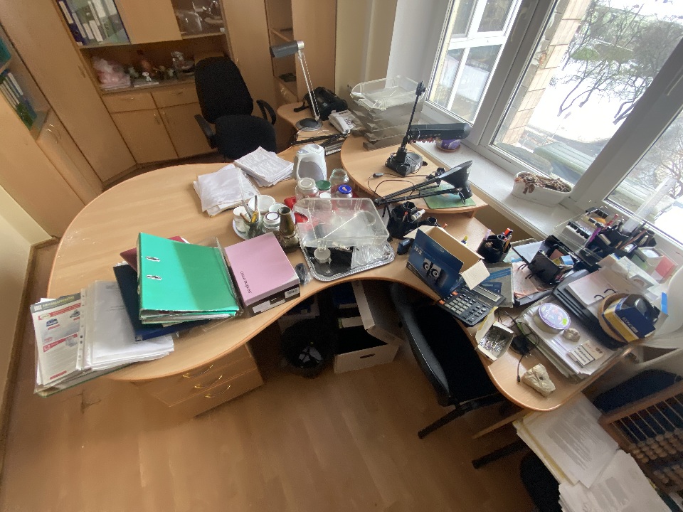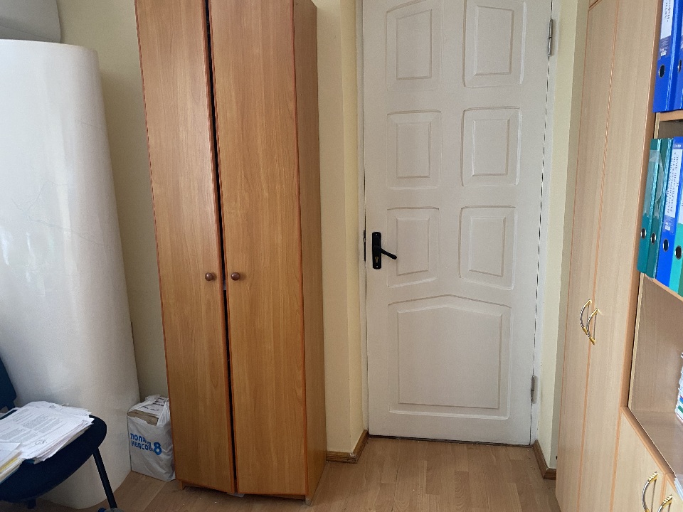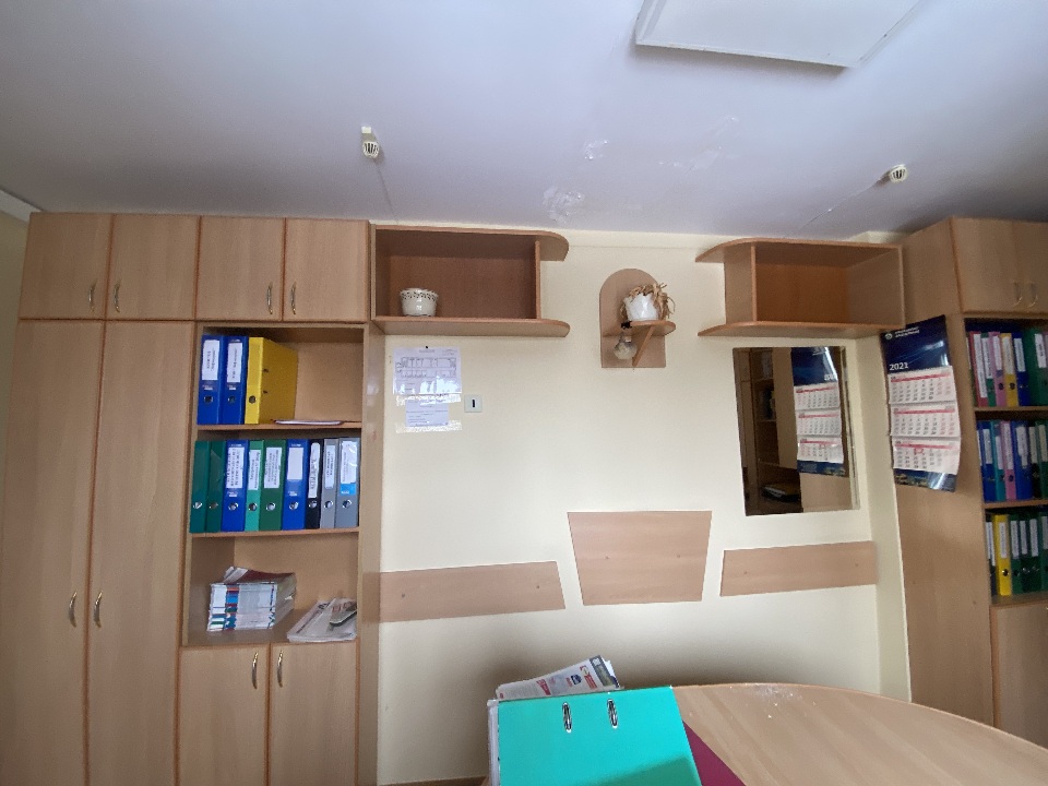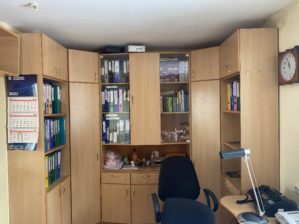 Комплект офісних меблів: стіл офісний 2 од. б/в, стінка офісна з полицями та скляними дверцятами на сім секцій б/в, шафа офісна двохдверна 1 од. б/в. Меблі в задовільному стані, використовуються в офісному кабінеті для зберігання документів