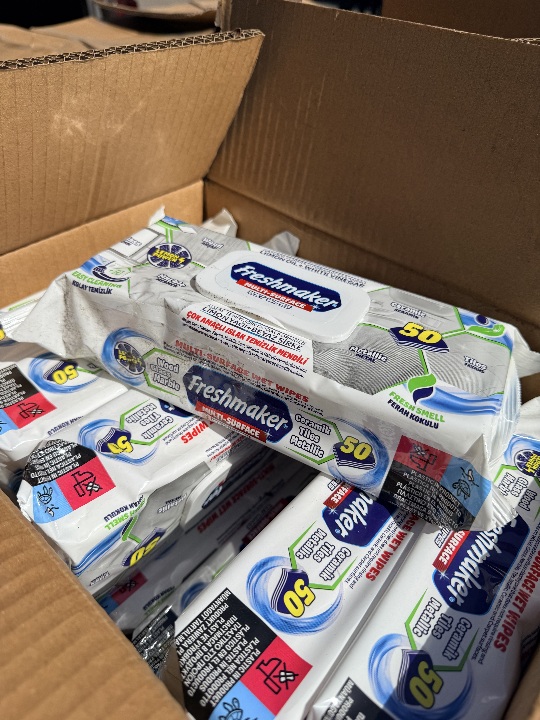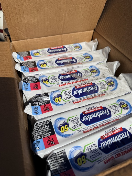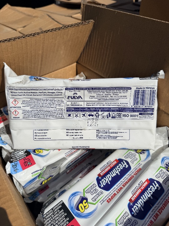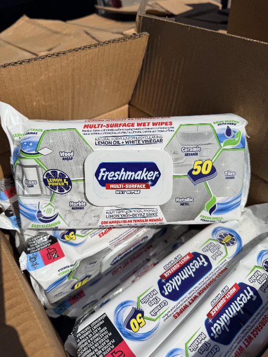Вологі серветки, виготовлені з нетканого натурального матеріалу, торговельної марки «FRESHMAKER MULTI-SURFACE WET WIPES» 50 PCS with fliptop, 168 пачок по 50 штук у кожній окремій пачці. Майно без ознак використання.
